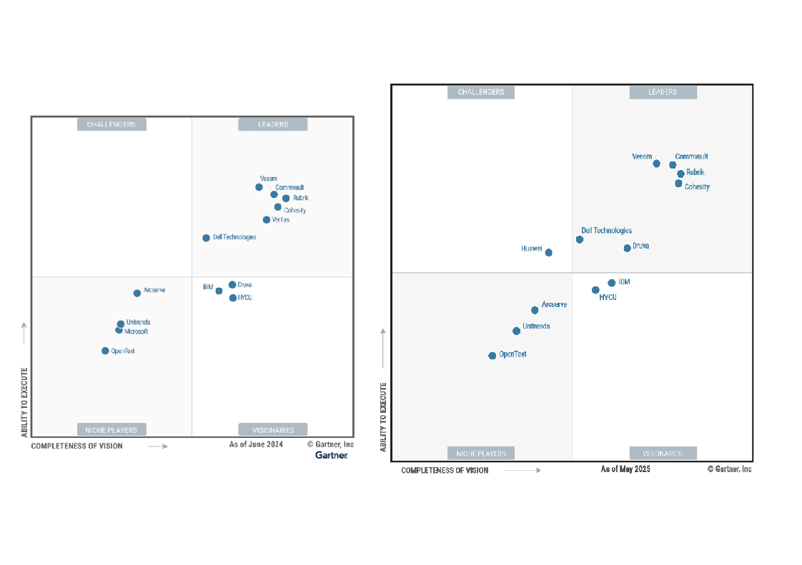 Sources: Gartner Magic Quadrant for Enterprise Backup/Recovery (2025); Gartner Magic Quadrant for Backup and Data Protection Platforms (2024).